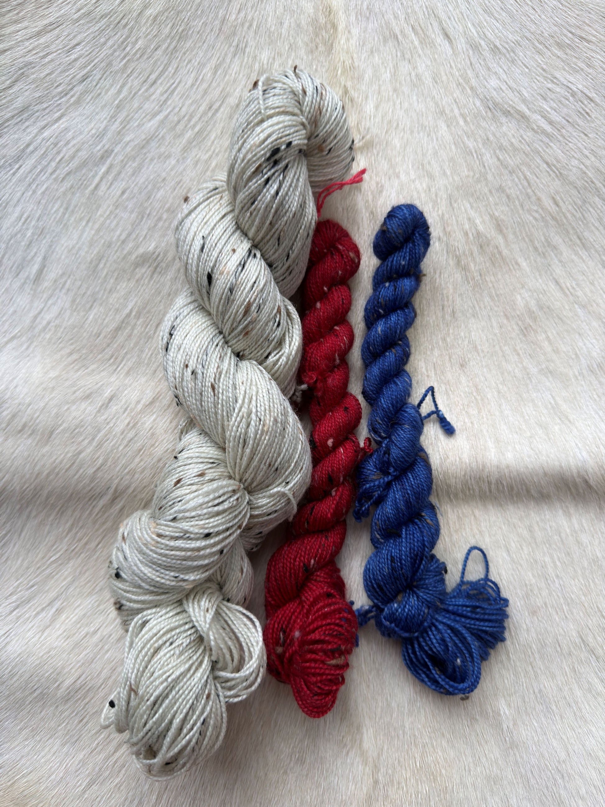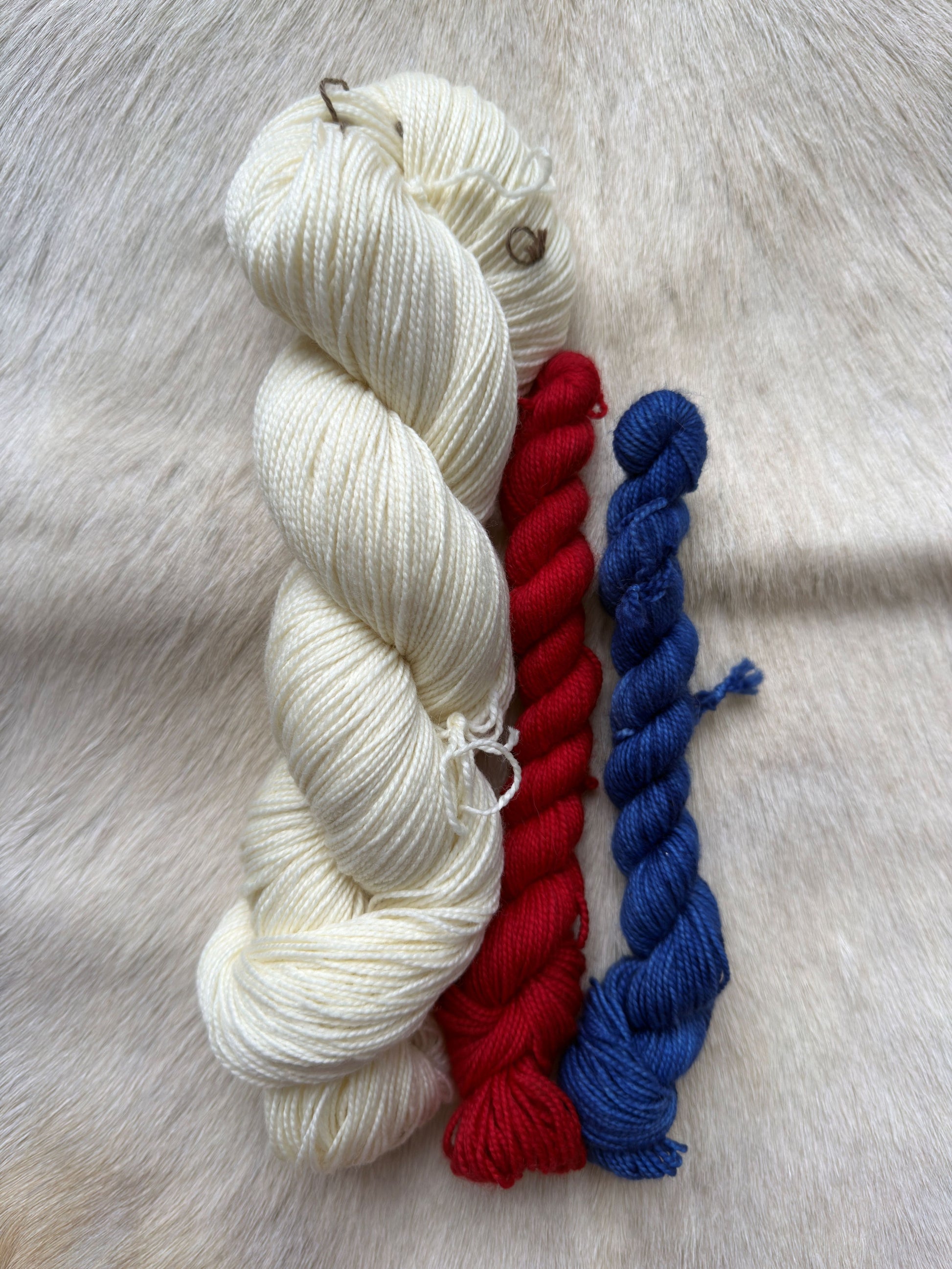 One full bare skein and two mini skeins for all of your Bills colorwork needs!