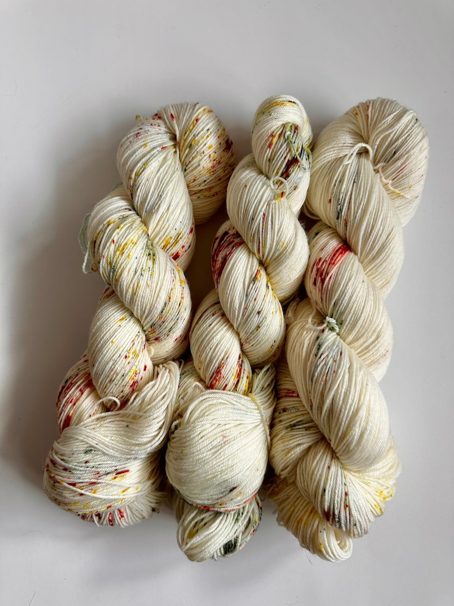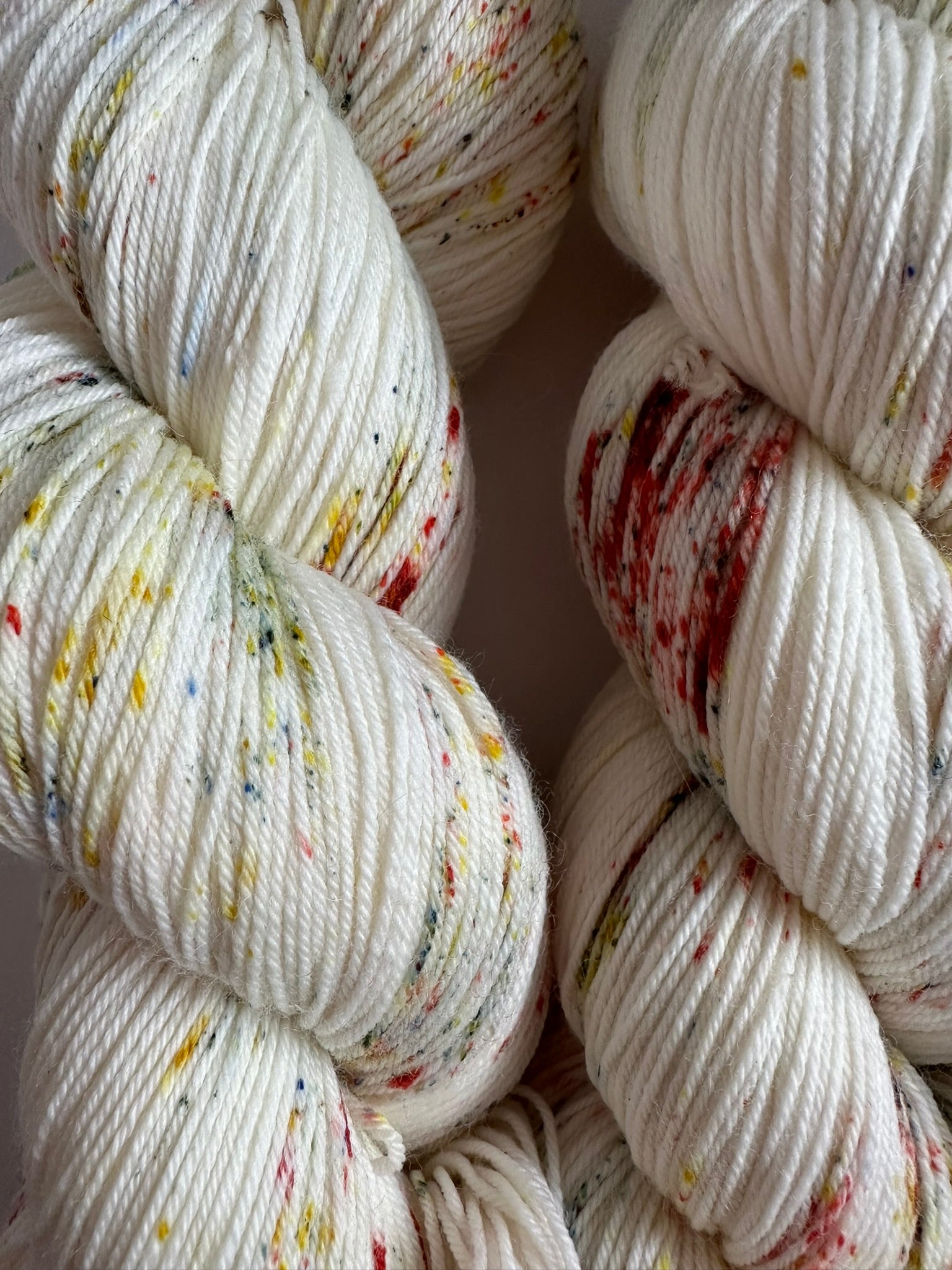 Red, blue and yellow speckles on a white base. Reminiscent of your first set of blocks.